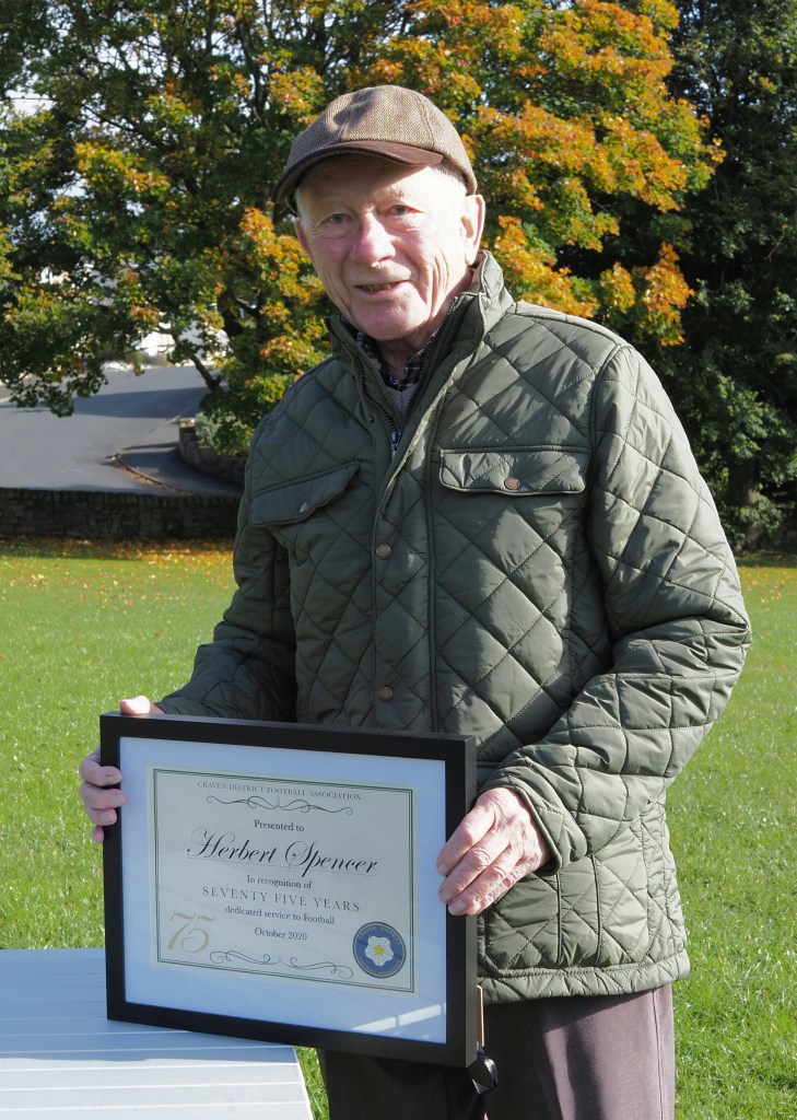 Well known Silsden gentleman, back in 2020 Herbert Spencer had completed 75 years’ service to Grassroots Football within the Craven area. This achievement was recognised with a presentation of a certificate to commemorate this wonderful achievement.